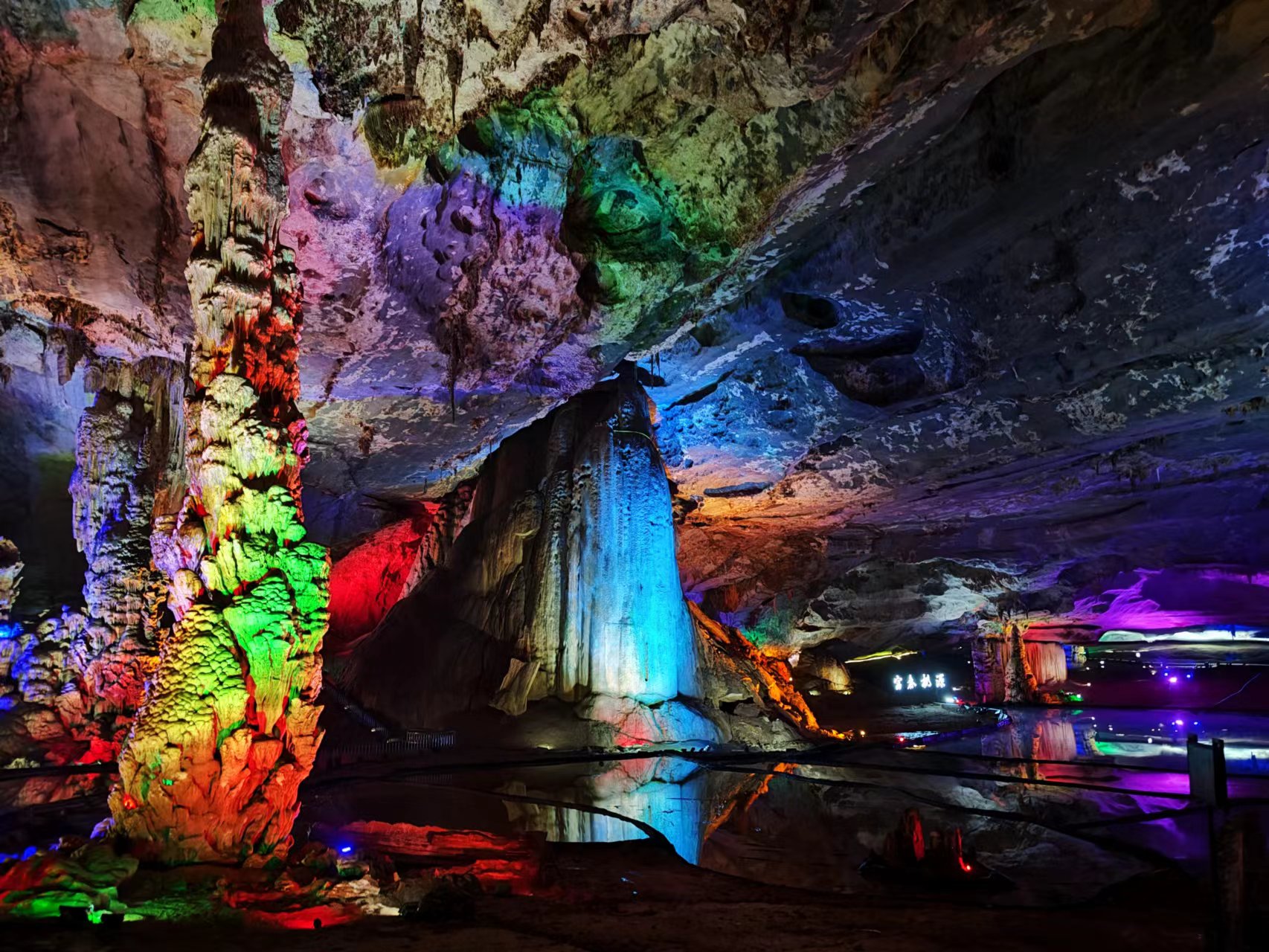 中餐后我們驅車前往富春桃源,參觀了亞太地區單廳面積最大的溶洞——九霄碧云洞。洞內面積2.8萬平方米,凈空最高處24米。這里冬暖夏涼,常溫保持在17度,我們一走進洞內,便感到陣陣涼意。洞內最高的鐘乳石被稱為“擎天玉柱”,其頂端一片“藍天白云”猶如被高高撐起。四周更是奇石嶙峋、千姿百態,構成23組神奇絢麗的石景,有神洲奇花,有黃果樹瀑布,有比薩斜塔,有泰國大象等等,令人目不暇接。