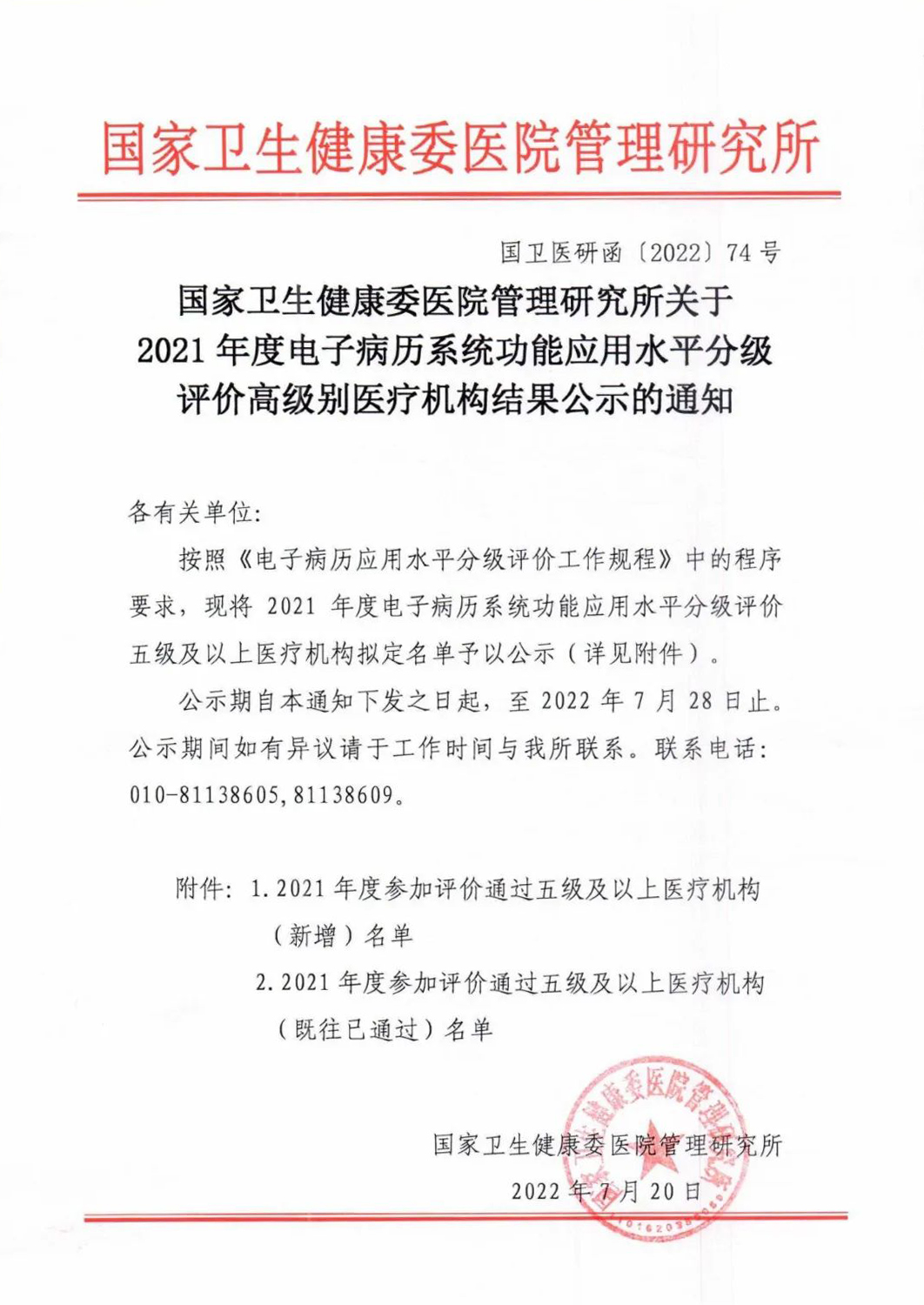 近日,國家衛生健康委醫院管理研究所發布了《關于2021年度電子病歷系統功能應用水平分級評價高級別醫療機構結果公示的通知》。