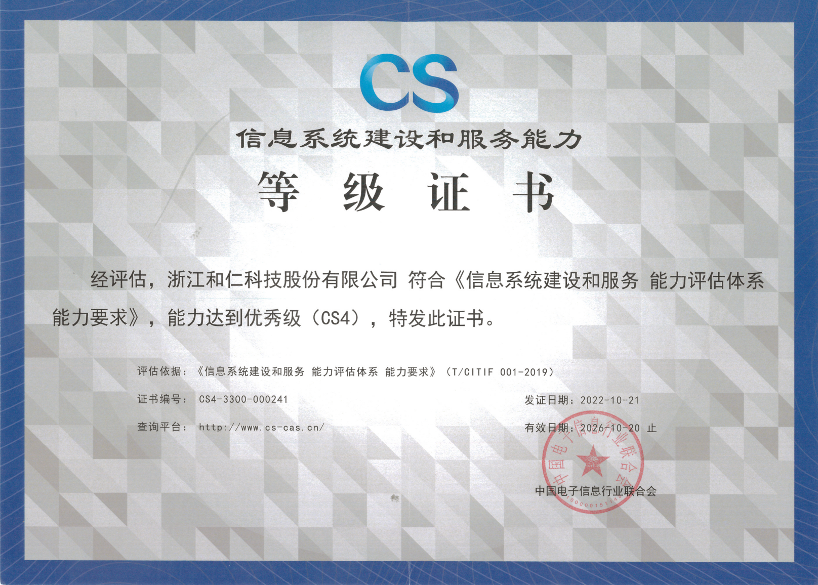 近日,經過企業自查、機構評估、現場評審、專家評審等一系列流程及公示環節,浙江和仁科技股份有限公司(以下簡稱“和仁科技”)獲得中國電子信息行業聯合會頒發的信息系統建設和服務能力優秀級(CS4 級)證書。