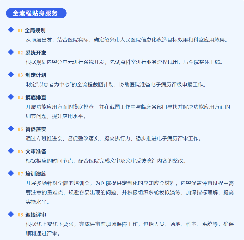 經過多年的積累,公司凝聚了一支包含醫院信息化專家、評級咨詢專家、特聘知名業內專家顧問等在內的專業評級項目團隊,負責詳細解讀電子病歷評審標準,結合紹興市人民醫院實際工作流程,在院領導的統一指揮下,協同質控處、醫務處、信息中心、護理部及院內其他職能部門建立以提升臨床醫療質量為目標的專項小組,組織各臨床部門、臨床醫技醫輔、臨床醫護人員參與業務討論,進行“符合評審標準、結合醫院特色、提高臨床使用”的業務流程改造。