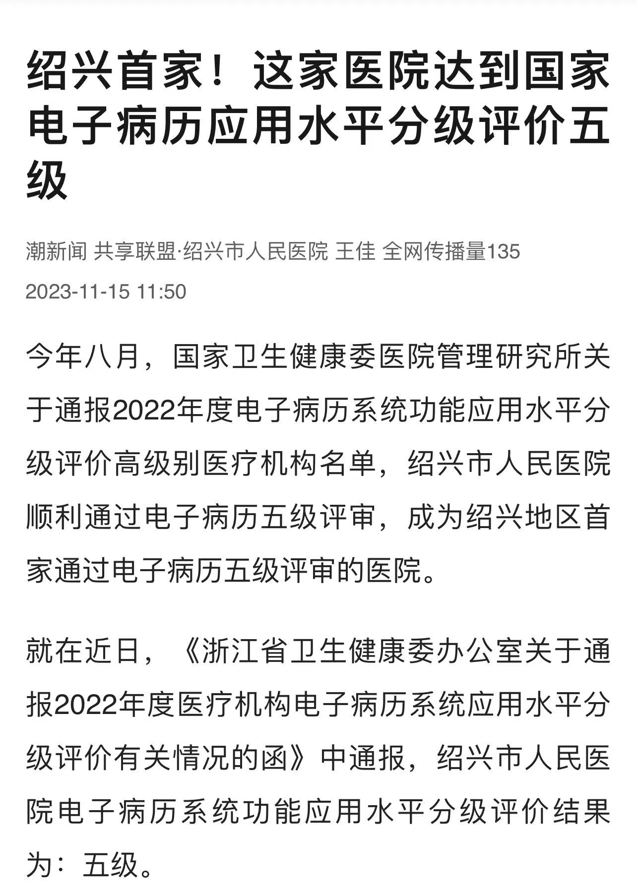 2023年8月8日,國家衛生健康委醫院管理研究所關于通報2022年度電子病歷系統功能應用水平分級評價高級別醫療機構名單,紹興市人民醫院順利通過電子病歷五級評審,成為紹興地區首家通過電子病歷五級評審的醫院,標志著紹興市人民醫院在智慧醫院建設、數字信息化、醫療質量水平、醫院管理效能等領域邁上了一個新的臺階。