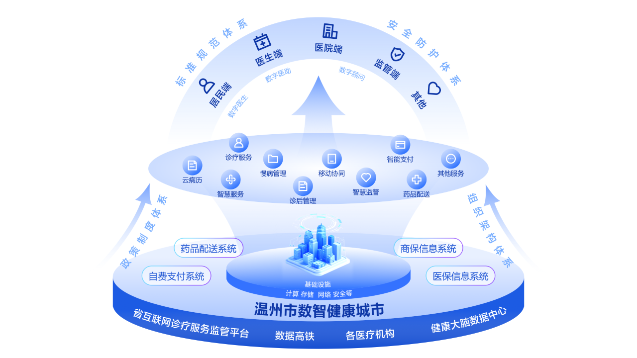 全域數據互通體系:基于微服務架構和容器化云部署,對接溫州市醫療健康數據高鐵,實現全市35家公立醫院HIS系統無縫對接,實時采集健康監測、設備運行等數據,打破機構間數據壁壘。同時,整合合理用藥、電子簽章、處方流轉等系統,形成“診療-審核-配送-結算”全閉環服務。