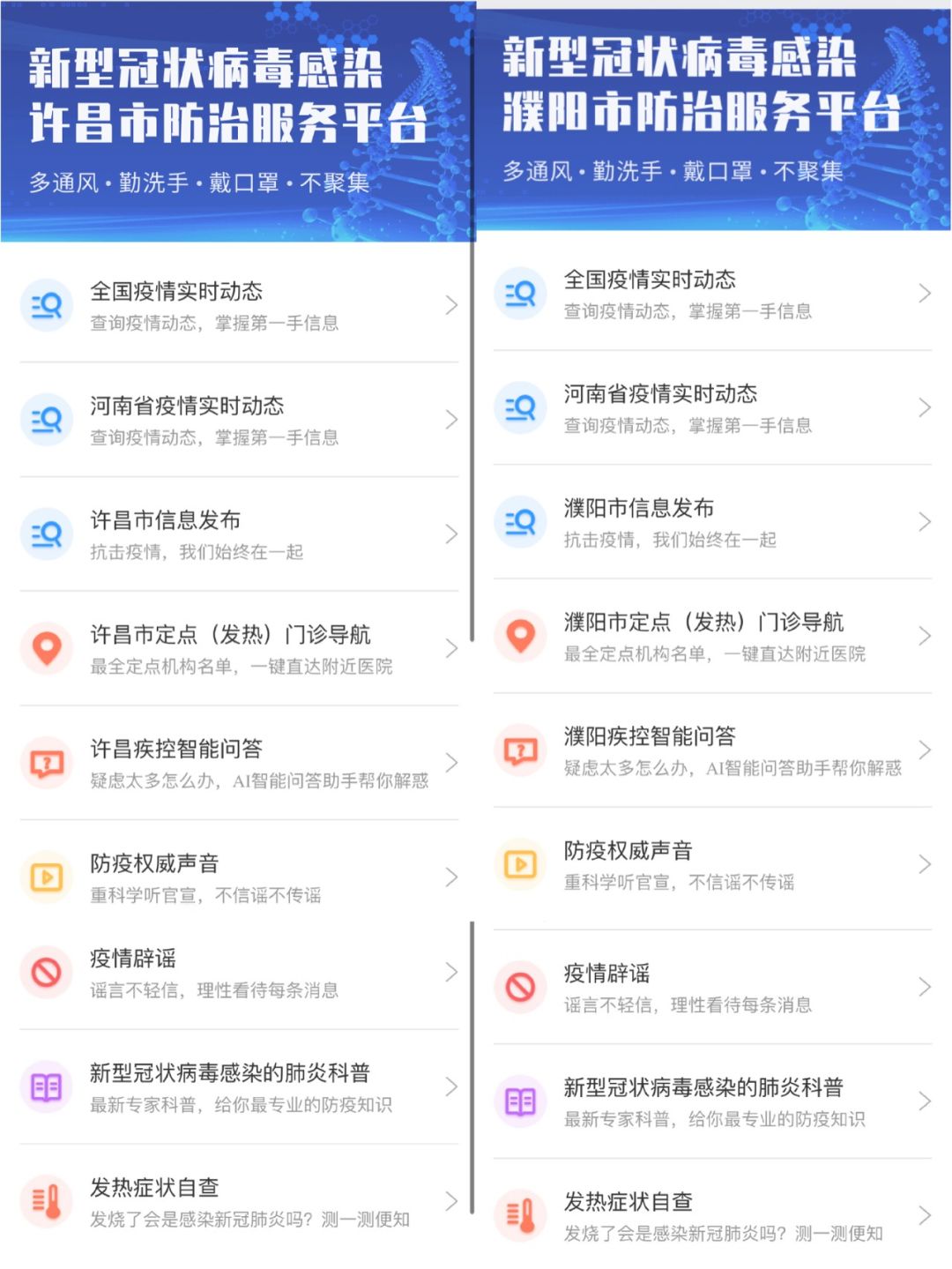 隨著防治服務平臺的正式上線,濮陽市、許昌市和延津縣居民可以隨時隨地通過手機在查看全國及河南省的疫情實時動態、地方權威指令公告及全面防疫指南等信息的同時,通過定點(發熱)門診導航、智能問答、防疫權威、疫情辟謠、防疫科普等板塊的設置,讓居民可以不信謠、不恐慌,正確認識疫情,堅定共同戰勝疫情的決心。
